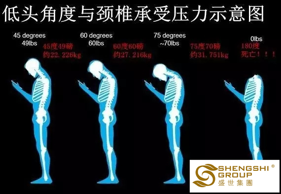 歐洲脊柱協(xié)會聲明中稱,一個人的頭部重約5kg,當前傾看手機等電子設備時,通常呈60°角,那么這時由于物理杠桿作用以及重力作用,一個人頸部肌肉就要承受25kg以上的重量。長時間保持這一姿勢,會出現(xiàn)頸部不舒服、疼痛、僵硬以及頭痛等癥狀長期以往,這些癥狀則會加重,造成頸椎病等遠期損害。
