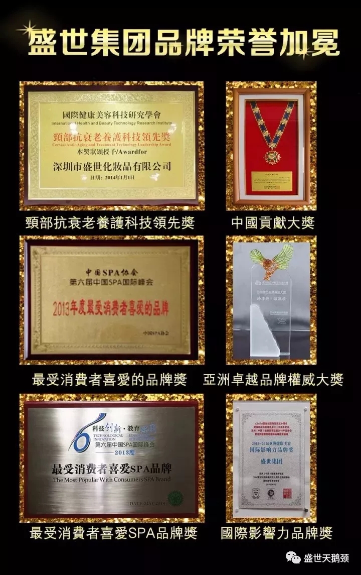 盛世集團,立足國際視野,旗下品牌所到之處無不掀起一股潮流;美頸36式專利技術以及專利儀器,曾在亞洲健康聯盟奧林匹克技能大賽上與十幾個國家同時競技,包攬了冠亞季三項殊榮。